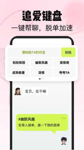 1、 功能多到离谱,跟开了“全能工具箱”似的:“追爱键盘”实时给你灵感;情感老师真人1V1陪练,相当于找了个代练帮你过剧情;“土味情话”、“案例教程”就是你的技能书;“恋爱人格测试”帮你知己知彼,摸清自己和妹子的“英雄属性”。